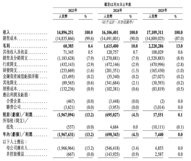 收入结构非常集中,网约车服务是绝对的核心支柱。2024年至2025年,网约车服务收入分别为137.25亿元、149.06亿元和163.35亿元,占总收入的比例从92.1%一路提升至95.5%。相比之下,汽车租赁业务的占比则从2024年的7.1%收索到了2025年的3.9%。至于技术服务、车辆销售等增值服务,占比仍然较低,2025年仅为0.6%。