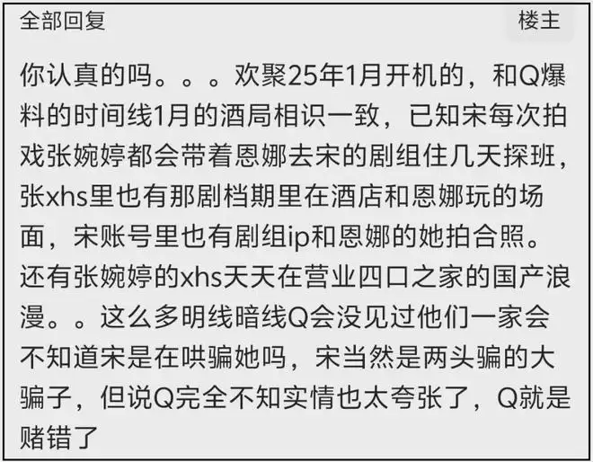 根据网友梳理的时间线,宋宁峰于2025年进入名为《欢聚》的剧组,与高露饰演夫妻。而作为高露的助理,Q女士也在组内。《欢聚》于2025年1月在浙江开机。这意味着,宋宁峰几乎是刚进组,就将目光投向了同组一位20多岁的女助理。
