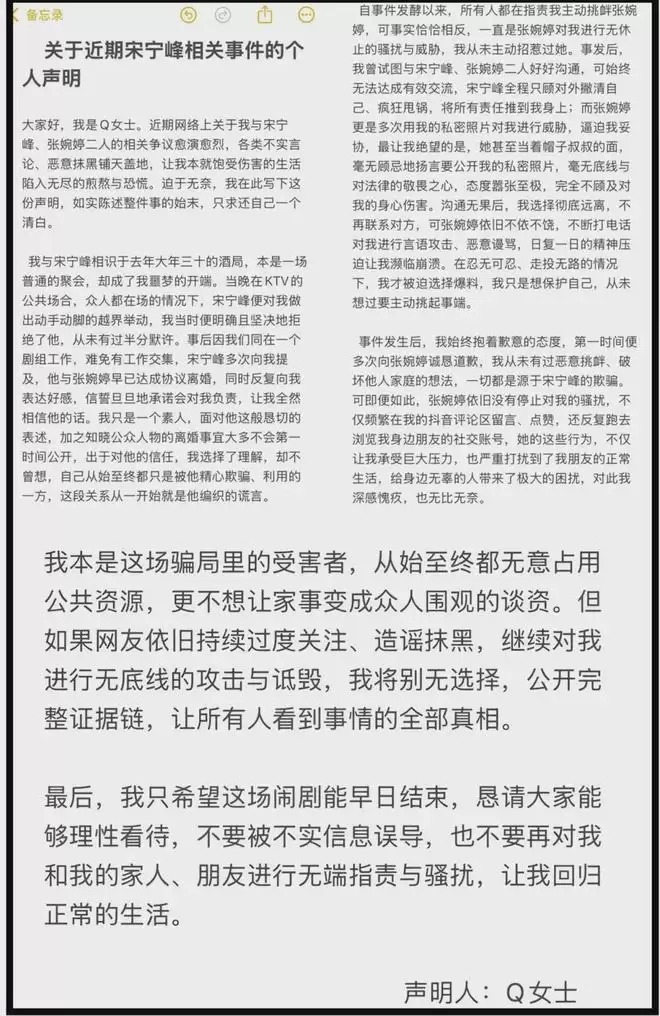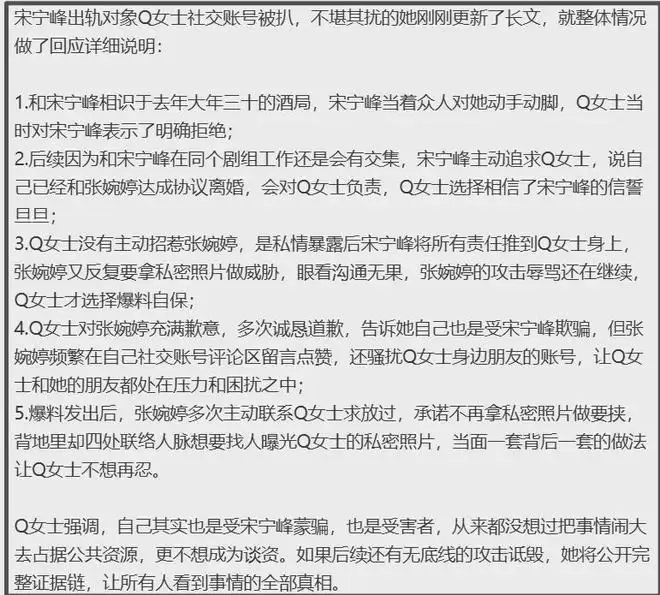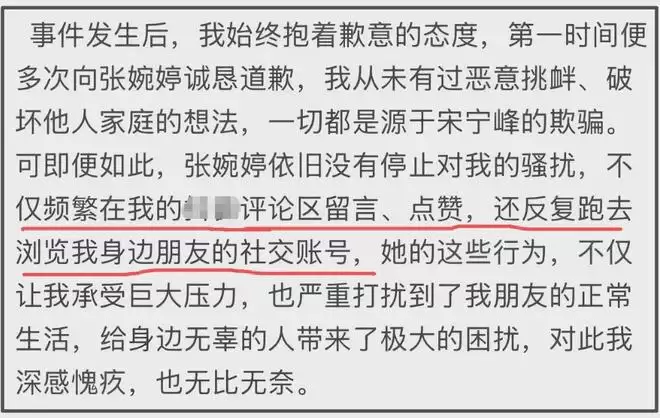不过,比起对宋宁峰的描述,Q女士的矛头似乎更多指向了宋宁峰的妻子张婉婷。她声称自己已多次向张婉婷道歉,但对方“不肯放过她”,不仅以曝光私密照片相威胁,还持续到她的社媒账号点赞、留言,甚至浏览她朋友的账号。