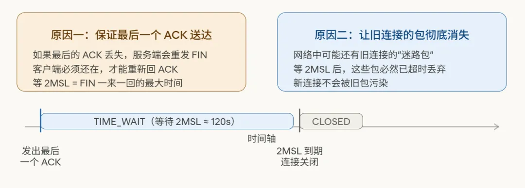 1. 确保连接可靠终止:若主动关闭方发出的最终ACK丢失,被动关闭方将重传FIN。2MSL的等待时间为重传FIN的到达提供了足够窗口,确保连接能彻底关闭。 2. 消除旧连接报文干扰:2MSL时间足以让本连接产生的所有报文在网络中自然消亡,避免其影响后续复用相同四元组(源/目IP与端口)的新连接。