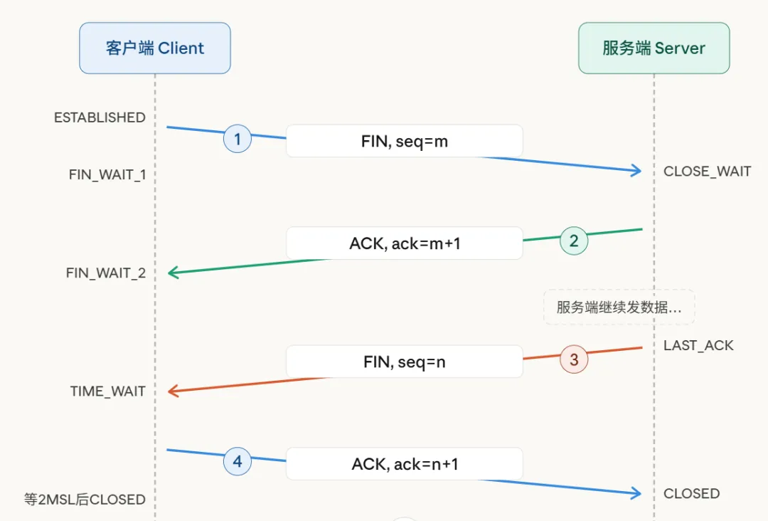 根本原因在于服务端收到FIN时,应用层可能仍有数据待发送,因此ACK与FIN不能立即合并。但在特定场景下(如服务端无待发数据),其ACK与FIN可合并发送,形成“三次挥手”。Linux的延迟确认(Delayed ACK)机制有时会促成此类合并,但这属于优化特例,而非协议标准行为。