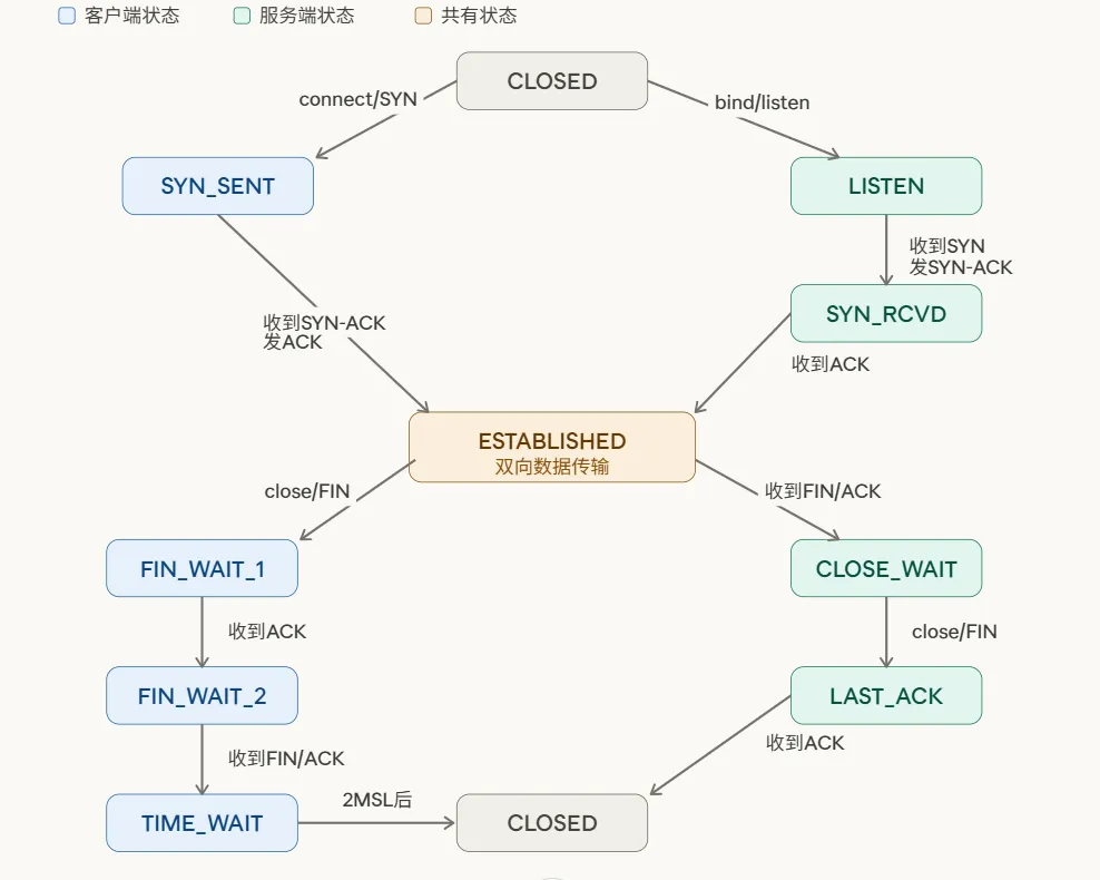 这张状态转换图是理解TCP生命周期的核心。图中清晰划分了客户端(通常为主动发起方)与服务端(通常为被动监听方)的状态迁移路径。双方在ESTABLISHED状态汇合进行数据传输,并在关闭阶段遵循各自的路径完成资源回收。精通此图,意味着你已内化了TCP连接的管理逻辑。