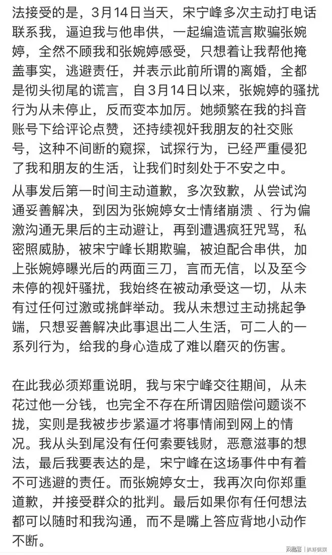 在声明的结尾部分,Q女士明确表示,在与宋宁峰交往期间从未接受过任何经济馈赠,所谓“金钱纠纷”的说法完全失实。她再次向张婉婷表达歉意,并表明愿意进行公开对话,但坚决反对任何私下的小动作。