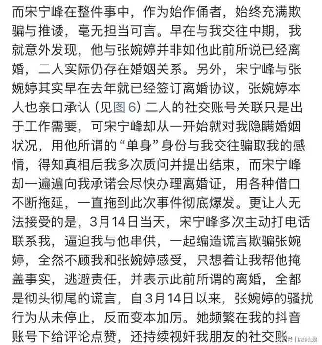 根据Q女士的陈述,事件的根源在于宋宁峰的隐瞒。两人交往期间,宋宁峰始终未明确其与张婉婷的婚姻状态,导致Q女士在不知情的情况下涉足其中。