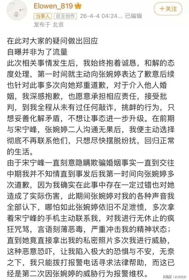 4月4日凌晨,事件中的关键一方Q女士通过社交媒体发布了详细声明。她强调此次发声并非博取关注,而是希望以诚恳态度推动问题解决。Q女士表示,她已在事发后主动联系张婉婷致歉,并对自身无意中卷入他人婚姻深感懊悔。