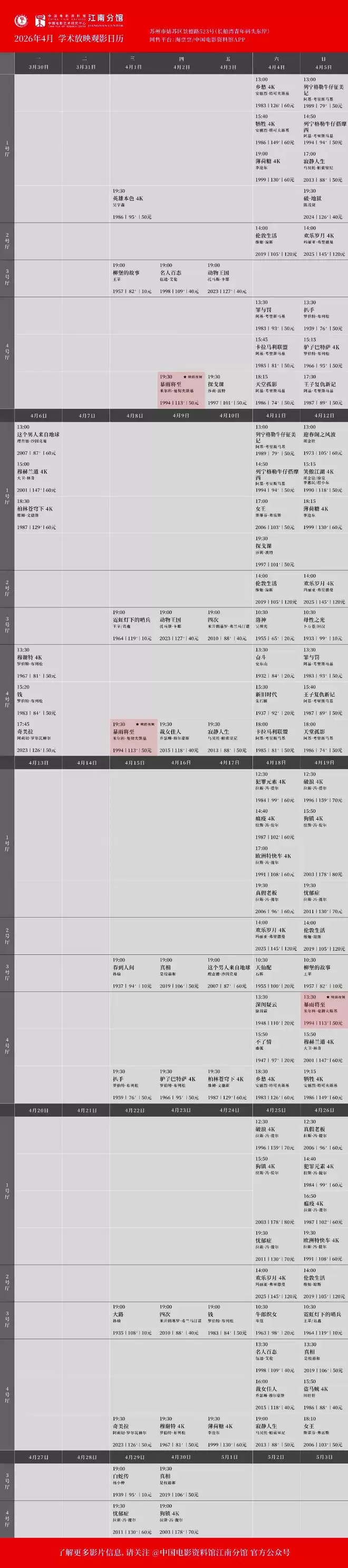 今日适逢清明节。北京主馆暂停放映一日,明日恢复;苏州江南分馆则全天开放,并特别策划了两部高口碑影片作为专场。完整片单与具体放映时间,已汇总于文末排片图表,供您快速查阅。