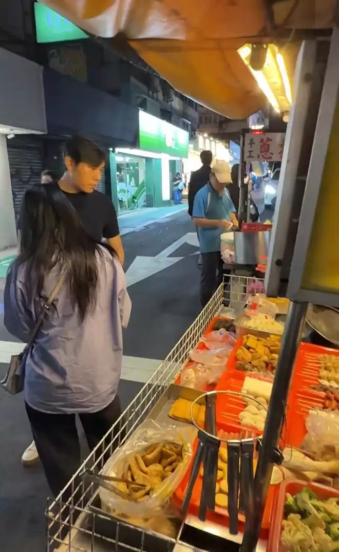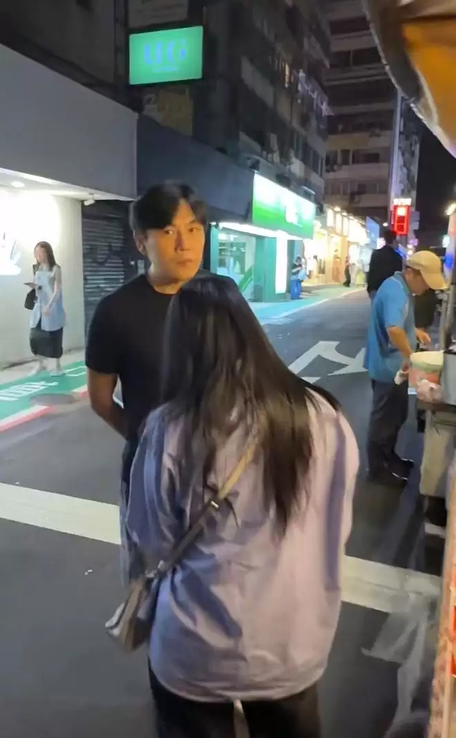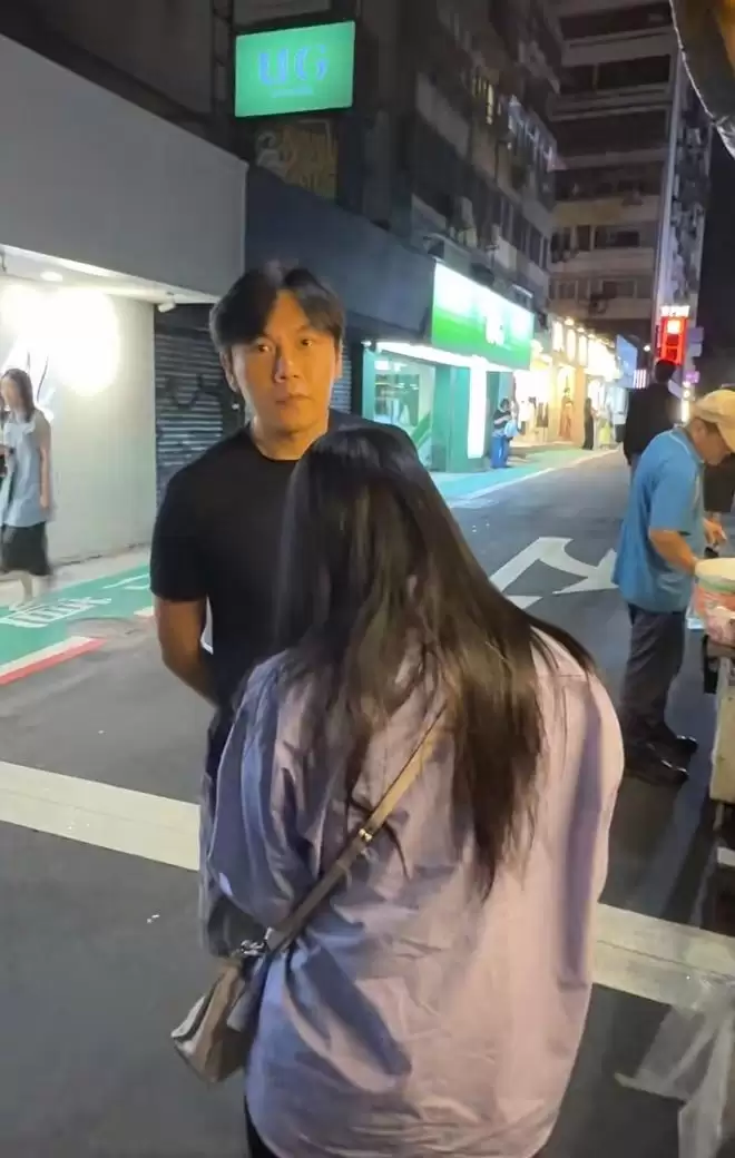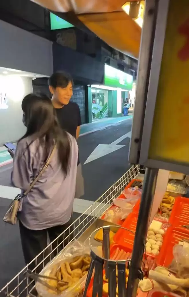 身旁的秦昊则展现出另一面。他正对摊位,目光专注地盯着美食,神情显得十分投入。当日他留着偏分发型,身穿黑色短袖T恤与及膝短裤,双手背在身后,站姿笔挺。发现被赵磊认出后,秦昊随和地向镜头微笑示意,随即注意力又回到了美食上。