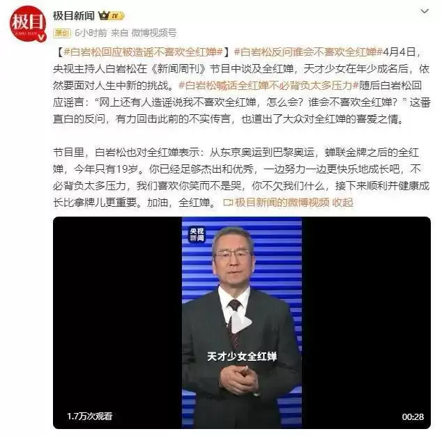 4月4日晚,央视《新闻周刊》播出后,主持人白岩松的一段表述引发了广泛关注。他直接回应了网络上关于其“不喜欢全红婵”的不实传言,言辞清晰有力。