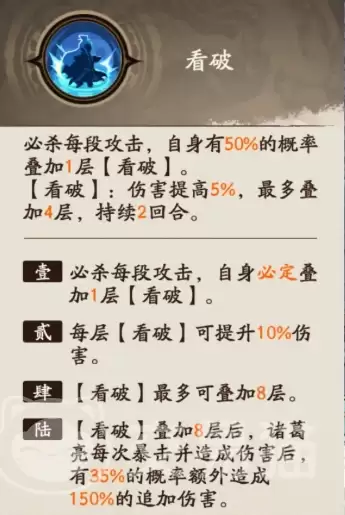 他的核心玩法,完全围绕“看破”这个天赋展开。具体来说,每次释放必杀技时,都有50%的概率触发一层“看破”,每层能为自身提升5%的伤害,这个效果最高可以叠加到4层。当天赋升到四星后,叠加上限会提升至8层,成长空间进一步打开。而到了六星状态,当“看破”叠满8层时,每次暴击还将有35%的概率触发一次追加伤害,伤害倍率高达150%。至于普攻“八阵”,虽然是单体远程攻击,基础伤害为100%,看似没有独立特效,但它能与“看破”的增益以及必杀技形成完美联动,从而显著放大整体的输出效率。