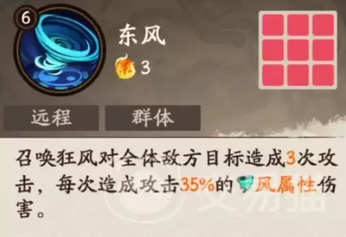 必杀技“东风”的覆盖面相当广,能打击九宫格范围内的全体敌方单位,总共造成3段连击,每段都附带35%的风属性伤害。这个技能与“看破”机制协同度极高——前期快速叠加层数,能大幅提升单次爆发的威力;当解锁二命效果后,“看破”甚至能自动叠加,操作更加顺畅;而在满命状态下,常规输出伤害会提升至115%,再配合多次触发的追加伤害,单轮总伤害理论上可达230%,其后期压制力之强,由此可见一斑。