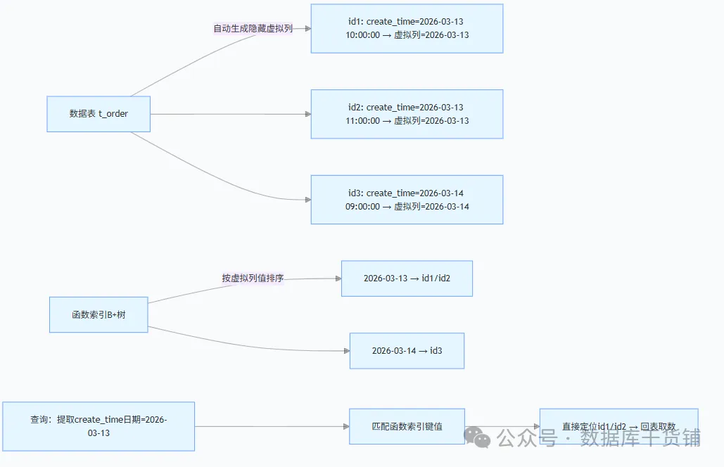 函数索引的破局之道在于:它直接对“函数处理后的表达式结果”建立索引。MySQL会在内部创建一个隐藏的虚拟列来存储函数计算结果,并为此虚拟列构建索引。当查询命中时,优化器可直接匹配预先计算并索引化的结果,避免了实时计算的开销,从而让索引生效。