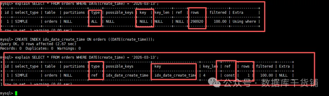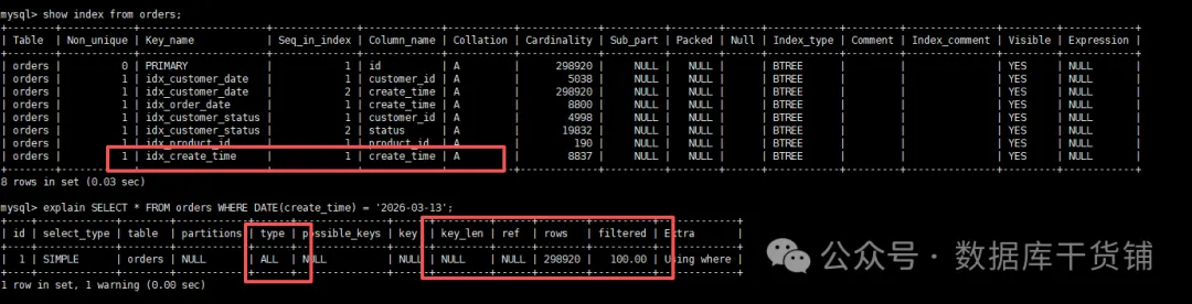 mysql> explain SELECT * FROM orders WHERE DATE(create_time) = '2026-03-13';