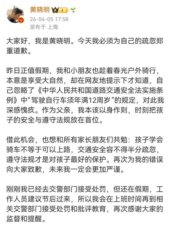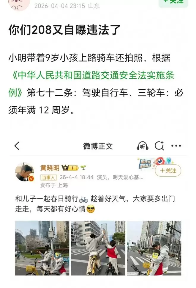 黄晓明分享亲子骑行照引热议,评论区秒变交通安全普法现场 清明假期,艺人黄晓明在社