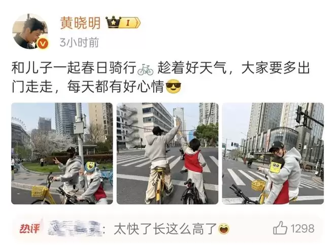 照片中,黄晓明身着浅灰色卫衣,骑着共享单车;一旁的小海绵则蹬着自己的儿童自行车。父子二人在人行道前击掌、合影,画面洋溢着春日暖阳般的温馨。