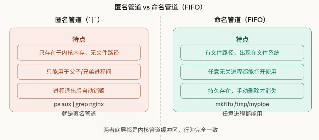 截至目前,我们讨论的都是匿名管道——即由“|”创建的类型。它仅存在于内存中,且只能用于具有亲缘关系(如父子进程)的进程间通信。