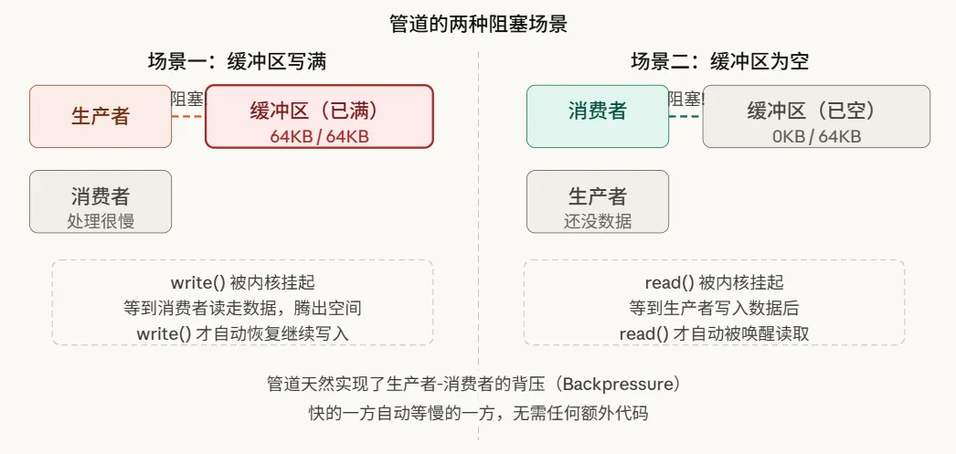 这个自动的“背压”机制是管道设计中最精妙的一环:开发者无需编写任何显式同步代码,速度快的一方会自动阻塞,等待慢的一方跟上,内核已默默完成了所有协调工作。