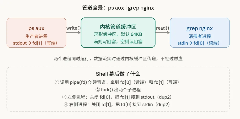 首先明确核心机制:我们在Shell中使用的竖线“|”,其底层是内核维护的一个环形内存缓冲区,默认容量为64KB。