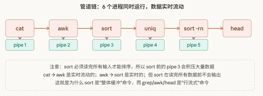 这条命令涉及6个进程和5根管道,所有进程并发启动,数据像流水线一样逐级向下游传递: