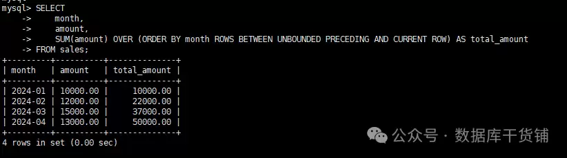 SUM(amount) OVER (ORDER BY month ROWS BETWEEN UNBOUNDED PRECEDING AND CURRENT ROW) AS total_amount
