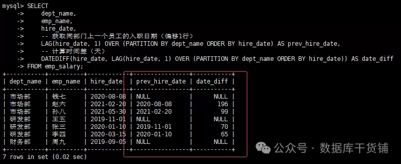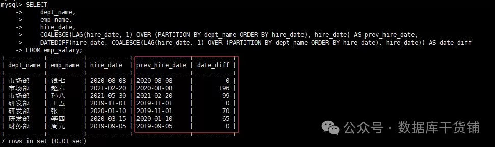 LAG(hire_date, 1) OVER (PARTITION BY dept_name ORDER BY hire_date) AS prev_hire_date,