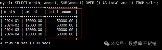 SELECT month, amount, SUM(amount) OVER () AS total_amount FROM sales;