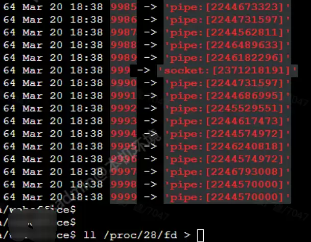 pipe(管道)类型,仅有少量网络socket。结论明确:这是一个典型的pipe文件描述符泄漏。