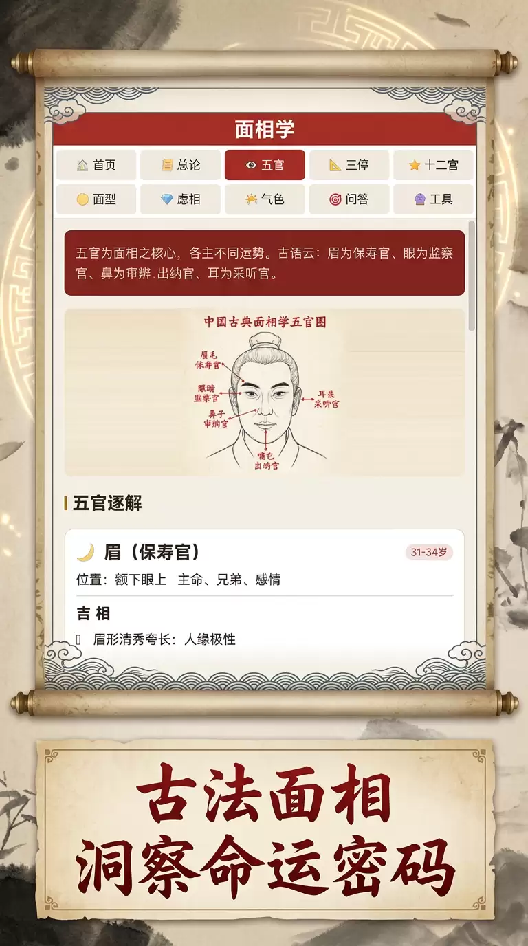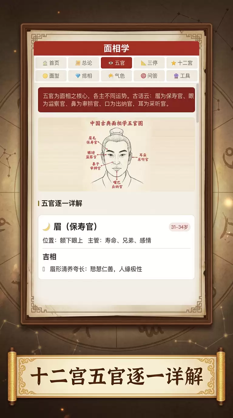 严格来说,《面相学》更像一个精心设计的传统文化知识应用。它系统地涵盖了面相学的七大核心模块:五官详解、三停分析、十二宫、面型分析、痣相解读、气色观察等,内容相当扎实。为了帮助理解,游戏内还配备了古典面相图谱,图文并茂,直观易懂。