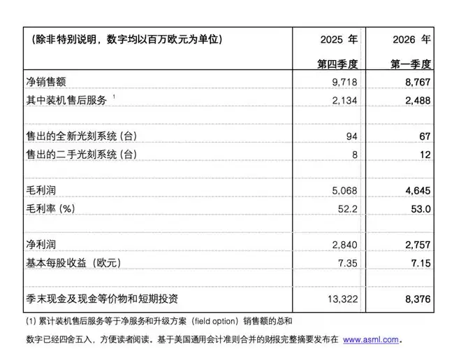 4月15日,ASML公布第一财季业绩。报告期内,公司净销售额达88亿欧元,毛利率保持在53.0%,净利润为28亿欧元。这份稳健的业绩背后,管理层对中长期前景的研判更值得关注。