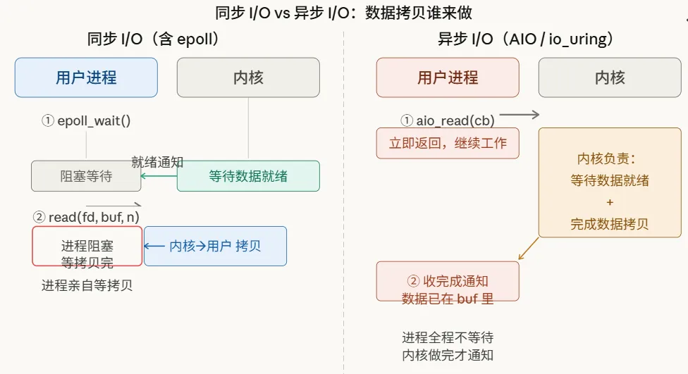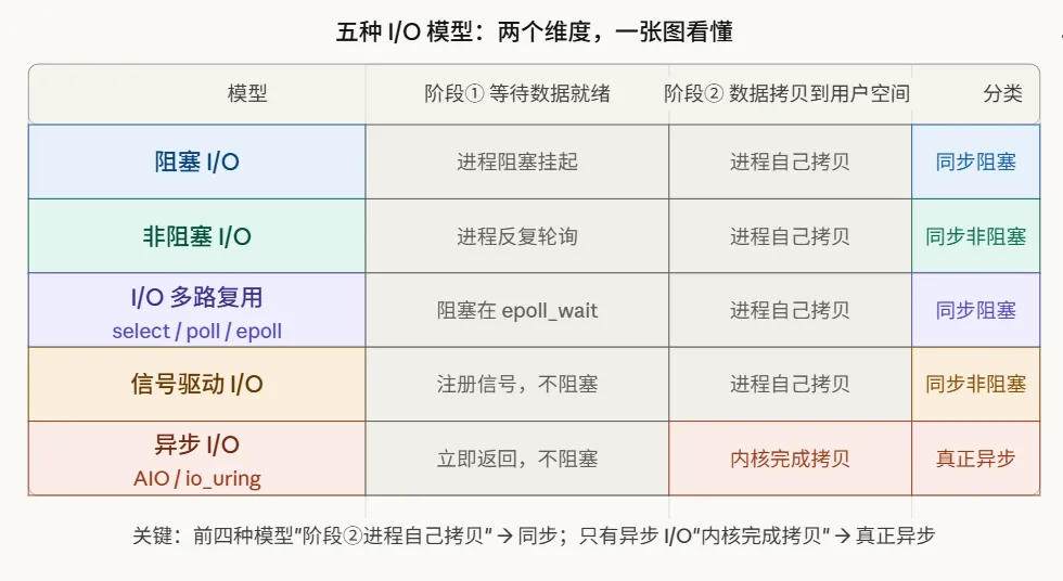 理解了这一点,你就能从根本上厘清概念,准确回答“为什么epoll是同步的”、“select为何是同步阻塞”、“io_uring才是真异步”这些问题,而不再依赖于死记硬背。