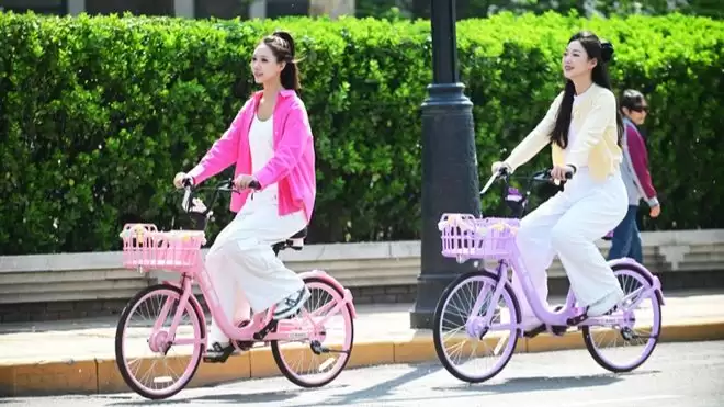“春日定制车”在视觉设计上颇具巧思。粉紫配色柔和清新,车筐装饰的花环元素与春季街景融合。更具创新的是车把处集成的香氛卡片,骑行时散发淡雅花香,提升了短途出行的感官愉悦度。