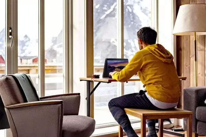 帐篷模式:稳定的V型立式结构,不仅确保机身稳固,更将底部散热进风口完全暴露,是散热效能最强的形态。特别适合在进行高强度3D渲染并外接显示器时,将其作为参考副屏使用。