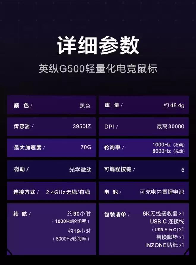 以下是INZONE G500 FNC联名电竞鼠标的详细规格参数: