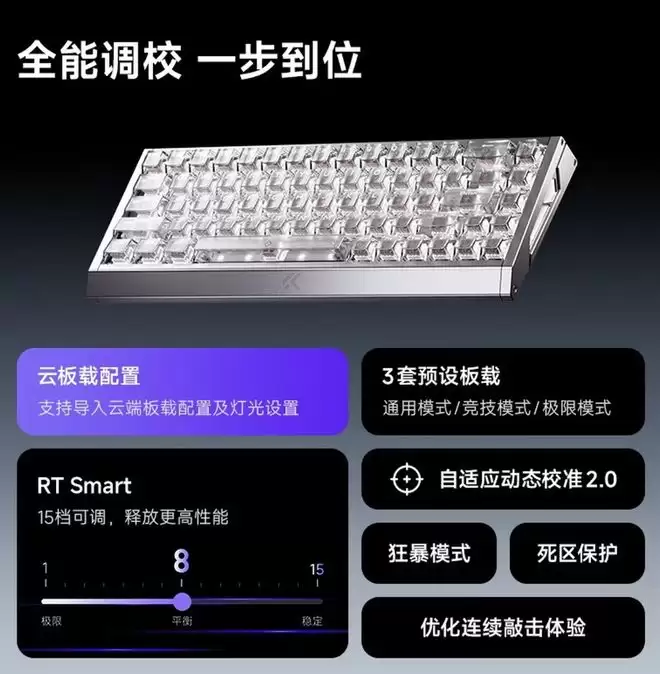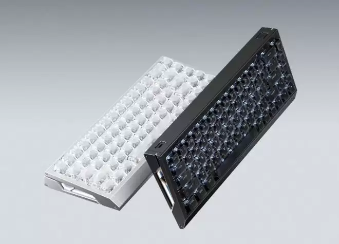 键盘提供银翼与幻影两种配色,延续了系列标志性的机甲战舰设计语言。全铝合金CNC阳极氧化机身确保了结构强度与视觉质感。侧边RGB氛围灯与原厂高度雾透键帽的组合,配合TTC宝马磁轴,在动态光效与精准触发之间取得了平衡。