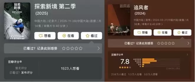 尽管该片在垂直的户外运动圈层内口碑不俗,但从大众平台数据看,其受众规模确实有限。以豆瓣为例,纪录片第二季目前仅约1500人标记“想看”。相比之下,王一博主演的剧集《追风者》相关标记人数已超20万。