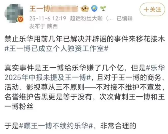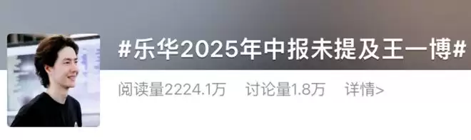 结果适得其反。此举未能缓解市场对乐华业务结构单一的担忧,反而激化了粉丝的不满情绪。#乐华2025年中报未提及王一博#等话题登上热搜,王一博可能不再续约的传闻自去年末起持续扩散。
