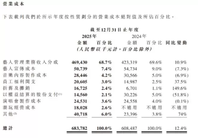 关键在于分成结构。乐华财报显示,其最大的成本支出项为“艺人分成”,占总成本约70%。2025年,此项成本接近4.7亿元,较2019年的2.4亿元近乎翻倍。同年公司总营收9亿元,净利润仅8000万元,净利率不足10%。