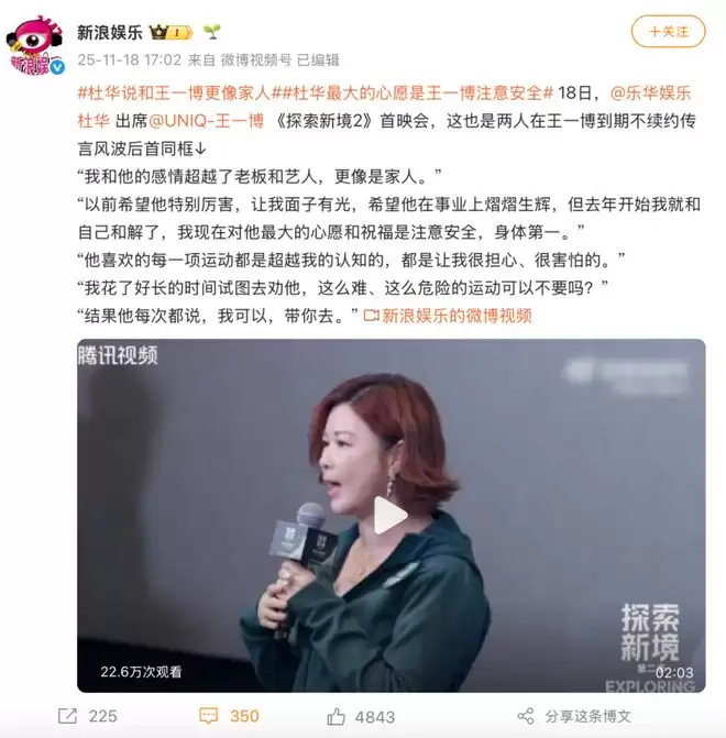 反观乐华,尽管在粉丝眼中存在诸多不足,但在允许王一博“做自己”这一点上,却提供了显著空间——或者说,不得不给予这种空间。近两年间,他几乎未接演影视剧,将大量时间投入小众纪录片及高风险户外运动。这些选择在纯粹的商业逻辑下并非最优,但乐华并未阻拦——这本身就是赋予自主权的直接体现。在《探索新境2》发布会上,杜华曾表示:“以前特别希望他特别厉害,让我有面子有光。但从去年开始,我跟自己和解了,现在对他最大的期愿是注意安全、身体第一。”