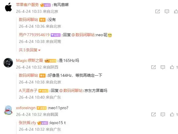 屏幕方面,除了确定的2K大直屏,刷新率成了新的关注点。当有网友追问是否为165Hz高刷时,博主的回复显得略有保留,表示“好像是144Hz”,并说明还需要进一步确认。看来,这块顶级直屏的最后一块拼图,还得再等等才能彻底揭晓。