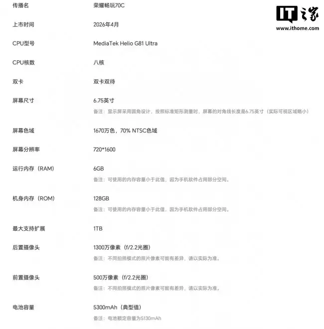 性能核心上,荣耀畅玩70C搭载了联发科Helio G81 Ultra处理器。这颗芯片大家并不陌生,其性能足以应对日常的社交、影音及轻度游戏需求。手机提供4GB或6GB的运行内存(RAM),以及64GB或128GB的存储空间(ROM),用户可以根据自己的预算和使用习惯进行选择。