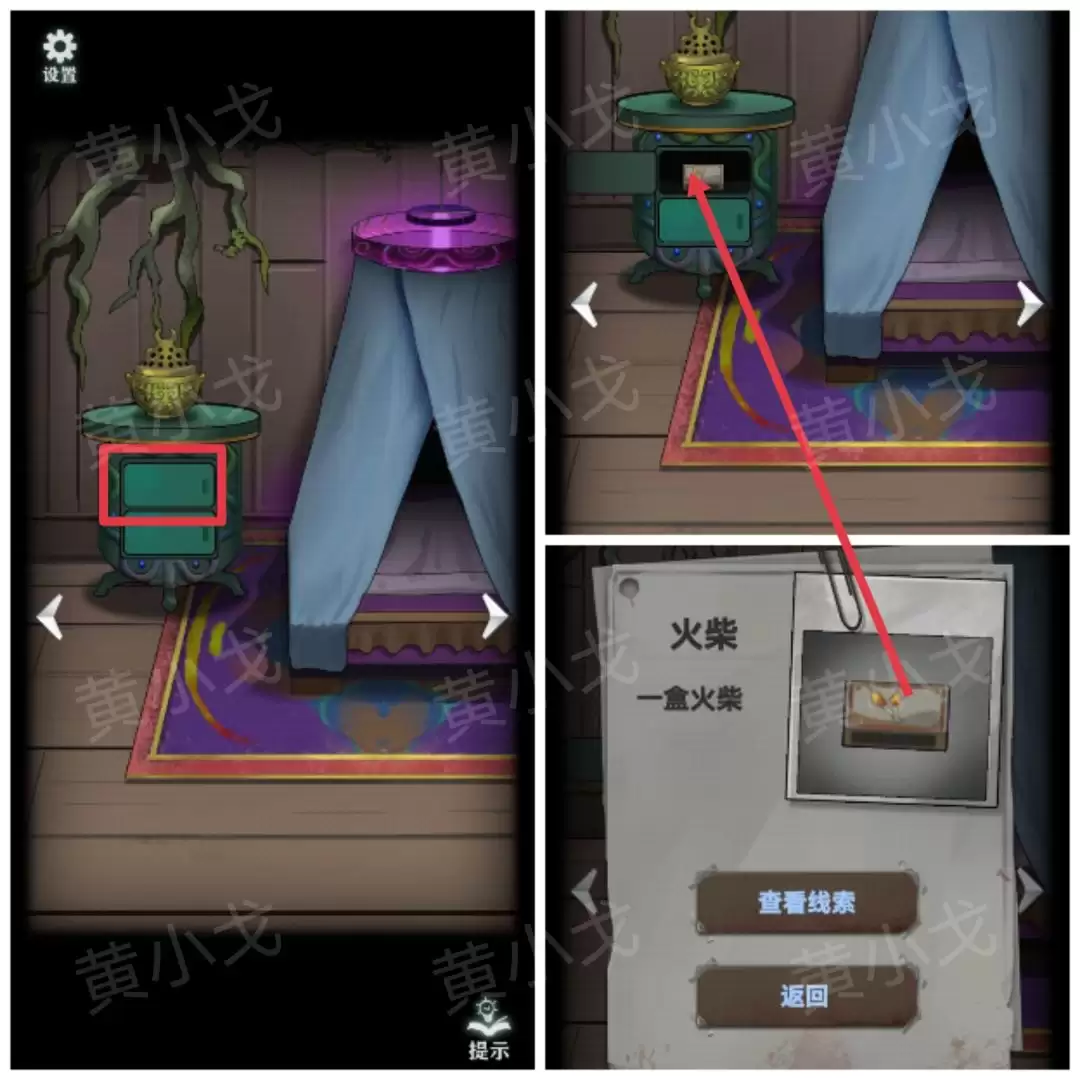 床边有个柜子,打开上层抽屉,获得【火柴】。