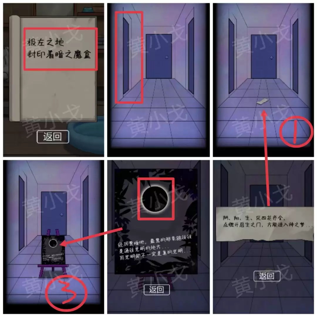 在这个“极左”路线上,还有额外发现:在进入第二道左侧门后,会看到一张纸条;进入第三道左侧门后,会出现一个画板。务必查看它们:①纸条提示“阴、阳、生、死四花齐全,点燃开启生之门”;②画板上则记录了一些神秘的符号及其位置。