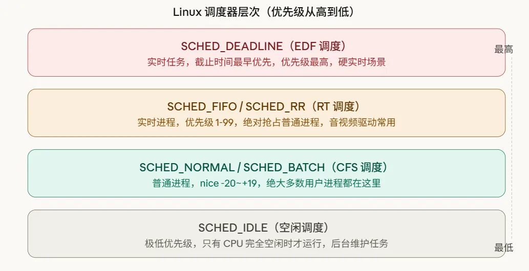 需要明确的是,CFS并非Linux调度世界的全部。Linux的调度体系是分层的,不同类型的任务走不同的通道。