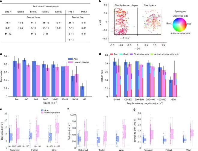 具体到发球技术,Ace能够运用15种不同的发球方式。在与精英球员的比赛中,发球后直接得分共拿下16分,而精英球员的总得分仅为8分;在与职业球员的比赛中,Ace使用了13种发球方式,并获得了4个ace球,而职业球员则获得了7个ace球。