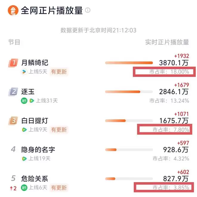 数据最能说明问题。根据最新统计,《危险关系》的全网正片播放市占率仅为3.85%,即便与迪丽热巴主演的另一部大制作《白日提灯》(市占率7.8%)相加,总和也仅为11.65%。而这个数字,仍远低于《月鳞绮纪》高达18%的市占率。此消彼长之下,黑马的成色十足。