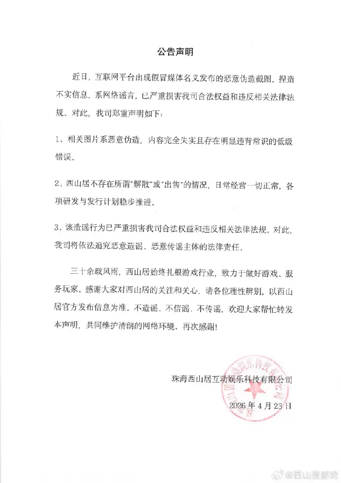 西山居严正声明:恶意谣言当止,公司运营一切如常 4月23日,游戏圈被一则官方声明刷屏