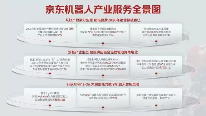 这份全景图背后,是京东已构建的深度产业布局。目前,京东已与近200家机器人及智能终端品牌达成生态合作。一项关键成果是,接入京东JoyInside一体化平台的硬件设备,其平均对话轮次提升了120%以上。这一数据直接反映了人机交互效率与用户体验的显著优化。其底层支撑,是京东提供的软硬件协同解决方案,该方案致力于双向赋能:一方面降低服务机器人的家庭落地门槛,提升其场景适应性与服务连续性;另一方面强化工业机器人在复杂产线、物流等场景中的作业精度与部署效率,切实解决产业端的自动化痛点。