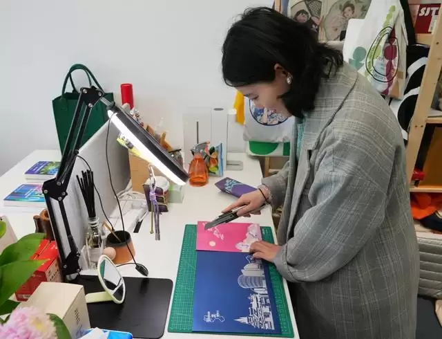走进静安大宁“视听静界·π空间”OPC创新社区“派客家”的一间办公室,在一排开放式工位中,刘奕秀的角落显得有些拥挤。办公桌上堆叠着金属、亚克力、特种纸等各类样品,身后的架子上错落摆放着数十本材质各异的纸样册,一旁还有她设计的文创成品——一个融合了NFC芯片的亭台式灯座。手机轻触,屏幕里便会播放出一段AI视频。
