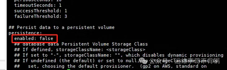 # 编辑values.yaml,禁用持久化存储选项