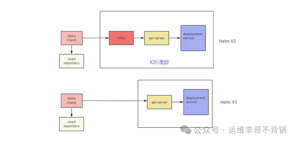 Helm 2依赖集群内服务端组件Tiller处理指令,存在权限管控风险。Helm 3移除了Tiller,采用无服务端架构,CLI直接通过kubeconfig与Kubernetes API交互,大幅简化了安全模型与部署流程,成为当前生产环境推荐方案。
