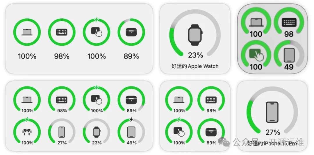 显示位置高度灵活,可根据你的工作流自定义。偏好极简风格,可仅让聚合图标驻留菜单栏;需要持续监控,则让它常驻Dock;习惯使用通知中心的用户,可通过小组件快速查看。其菜单栏图标能动态变化,以电池图形直观显示剩余电量,视觉风格与macOS原生UI高度统一。